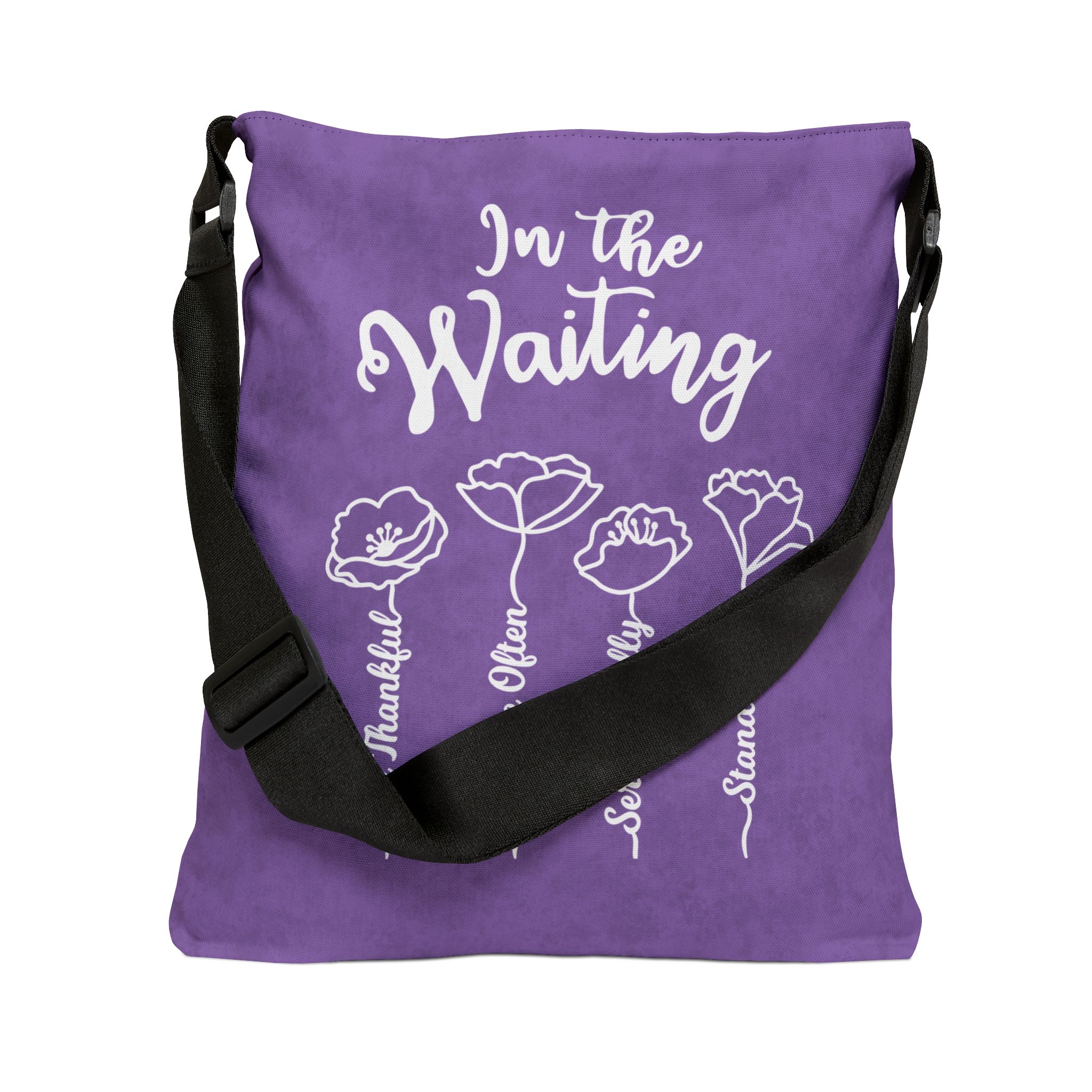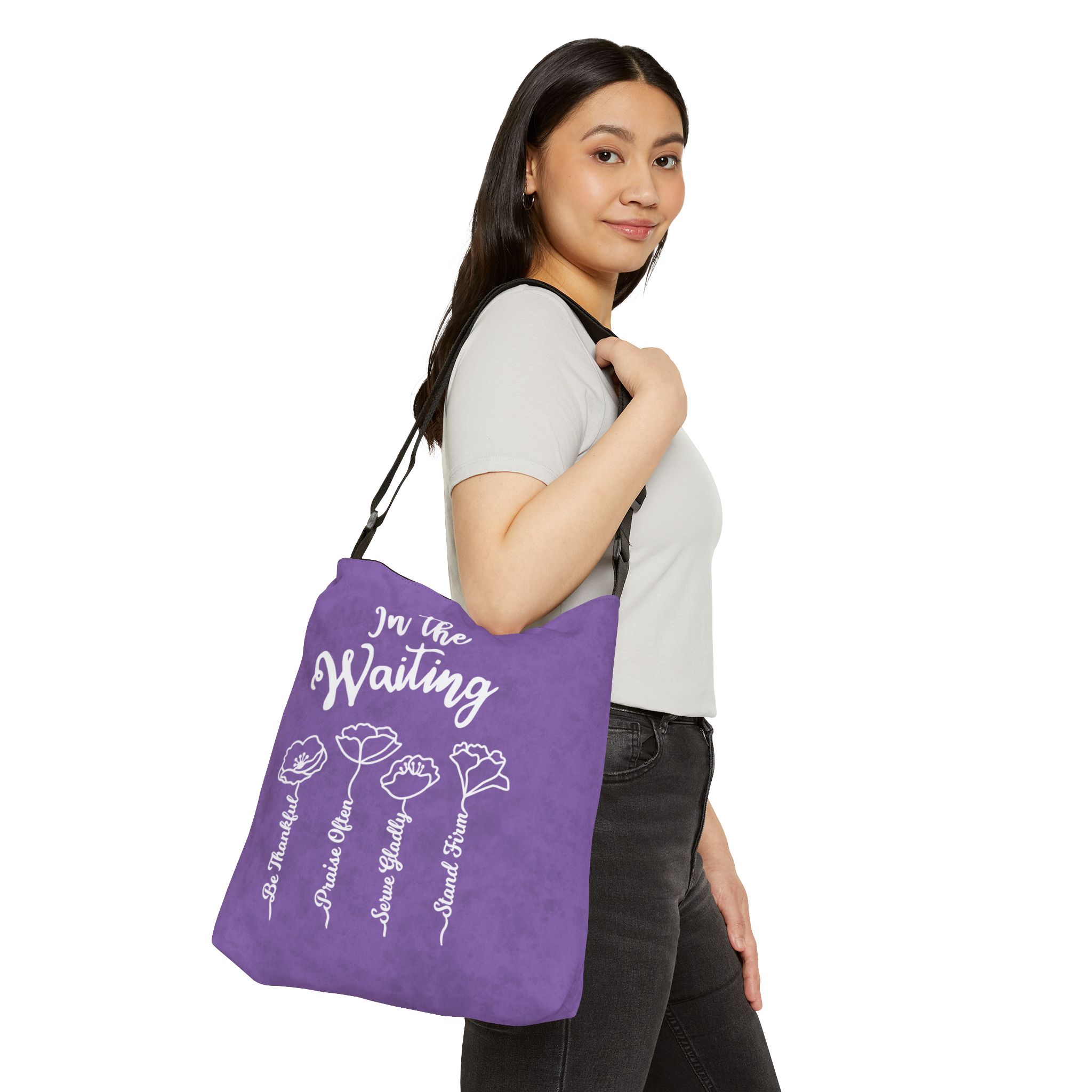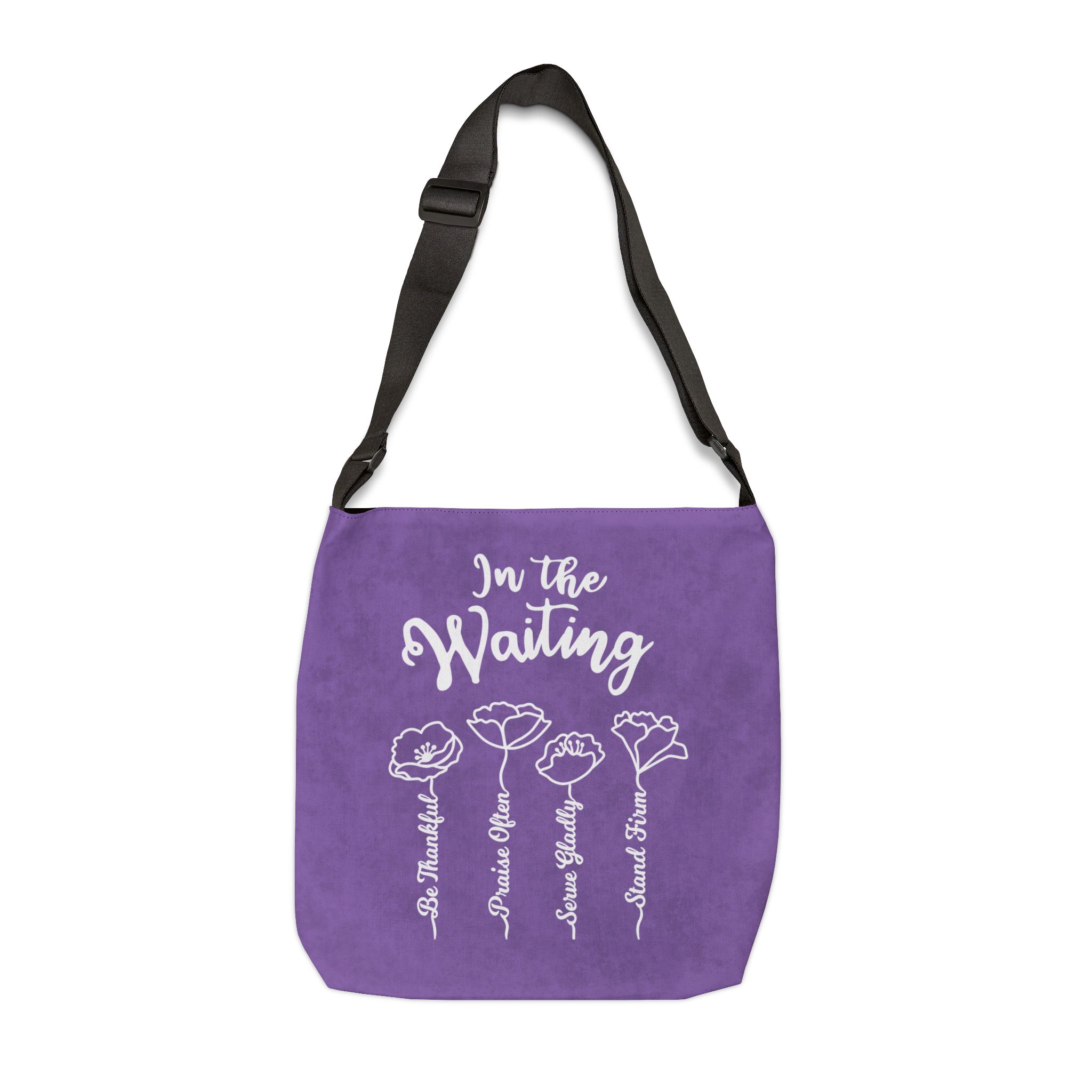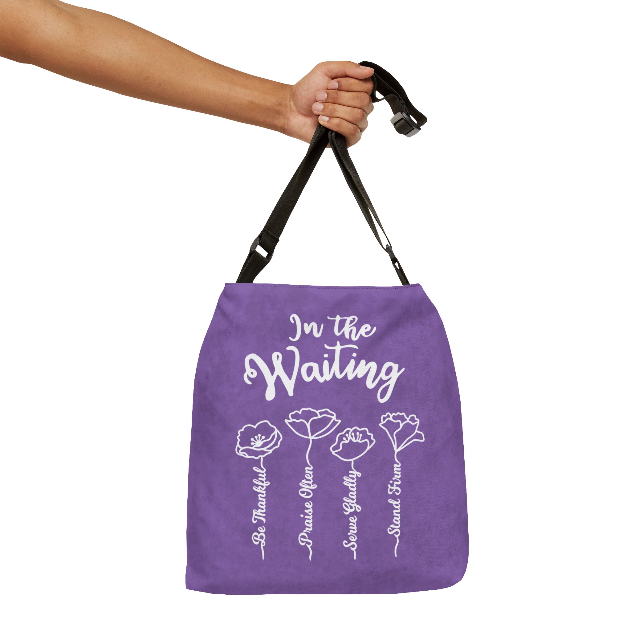 When you are waiting through a difficult season of life, let this be an encouragement to you. Text "In the Waiting, Be Thankful, Praise Often, Serve Gladly, Stand Firm". Purple background.