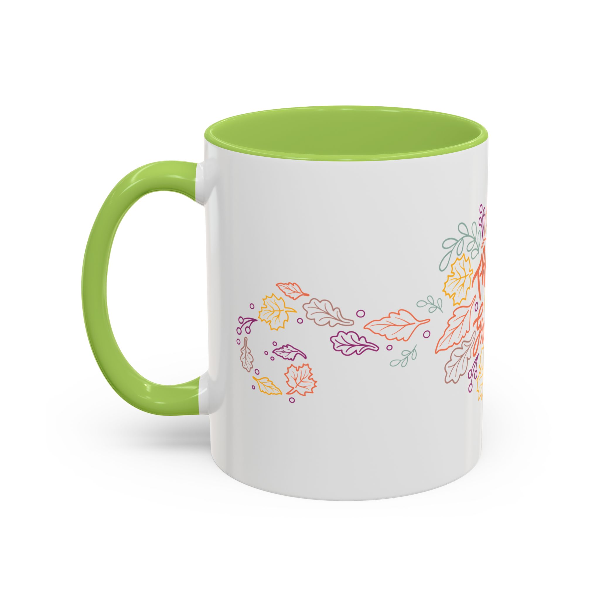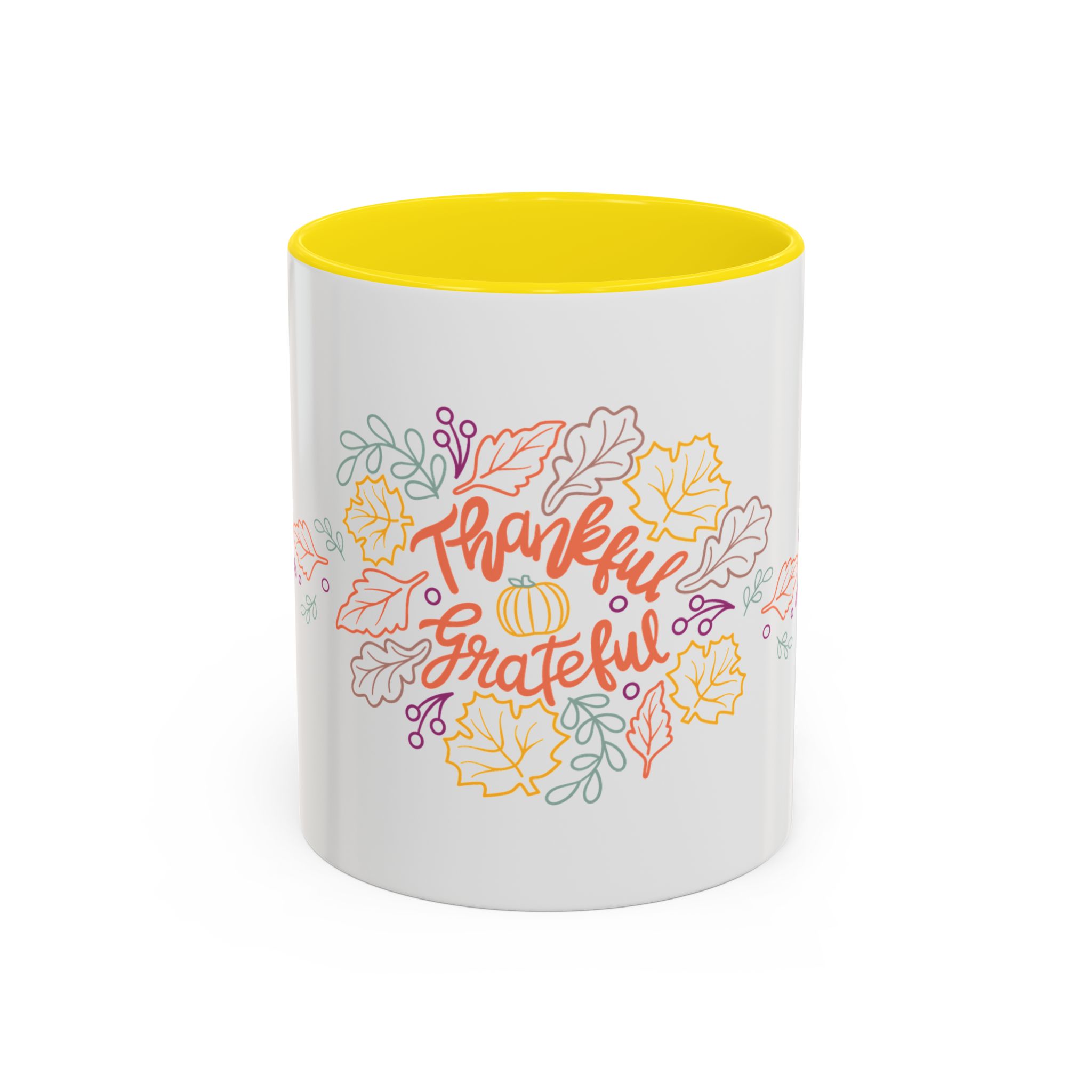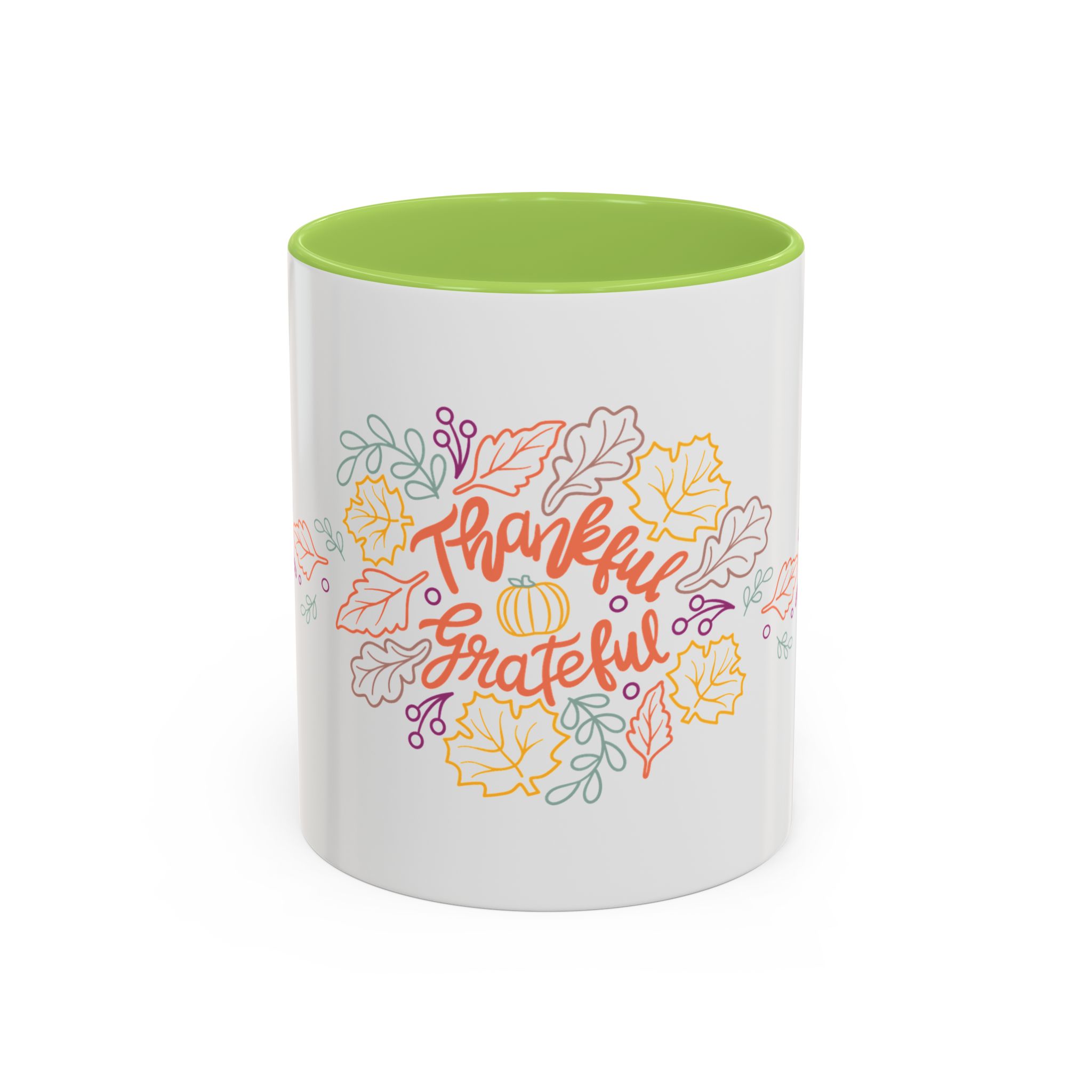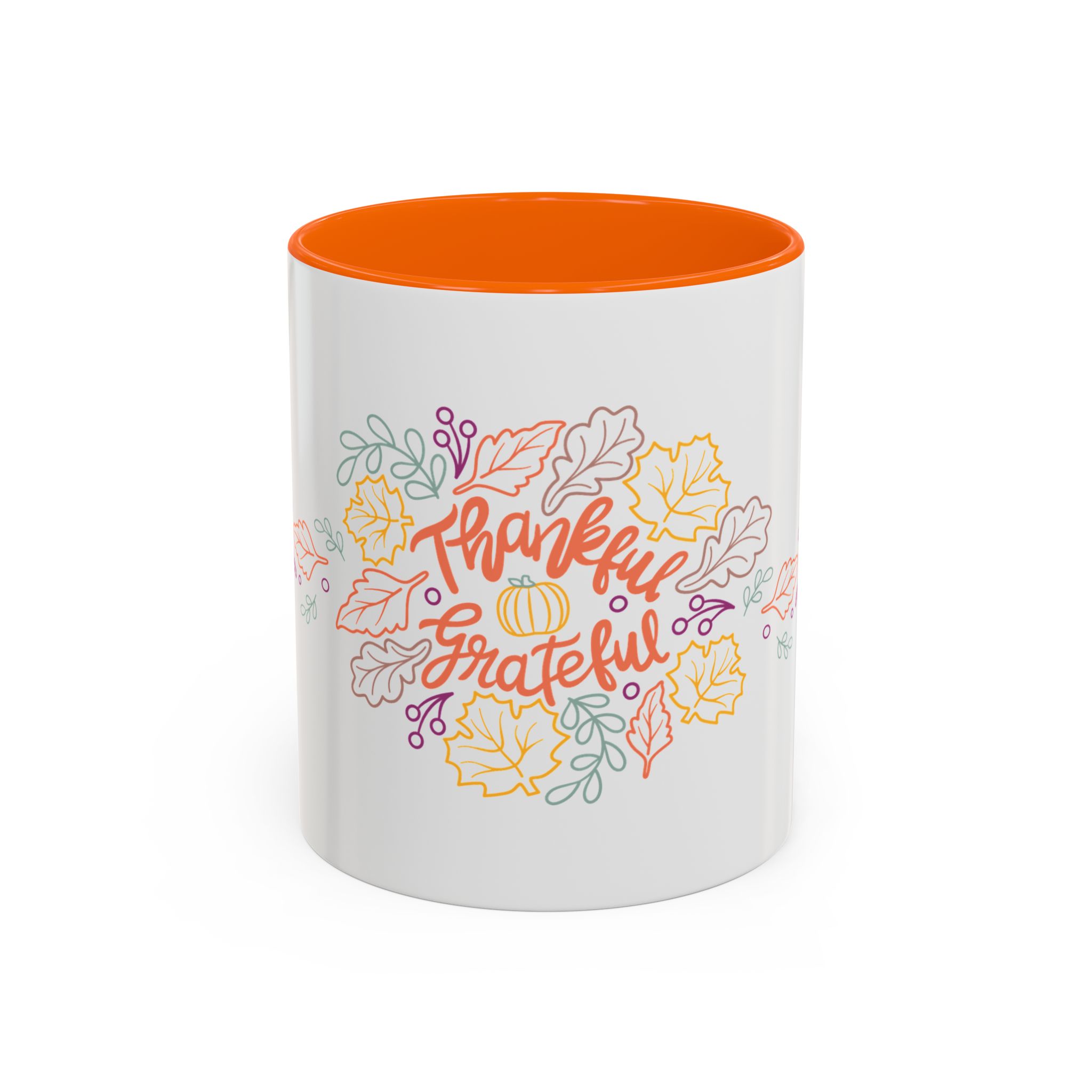 Falling autumn leaves swirl around the words Thankful and Grateful in this original design made by me; Scribbles the Scribe, with no AI involvement. This mug is available with 3 different color interior options.