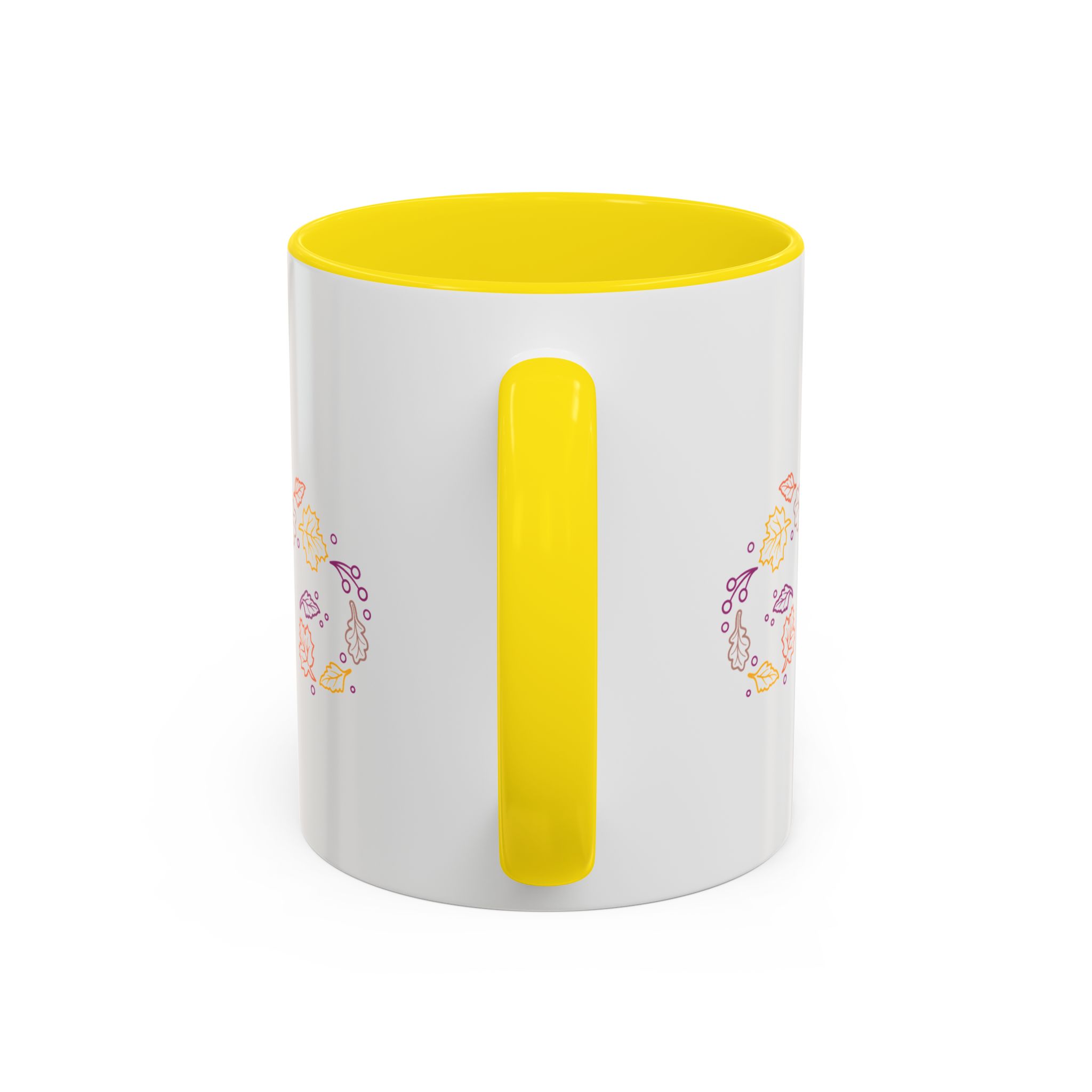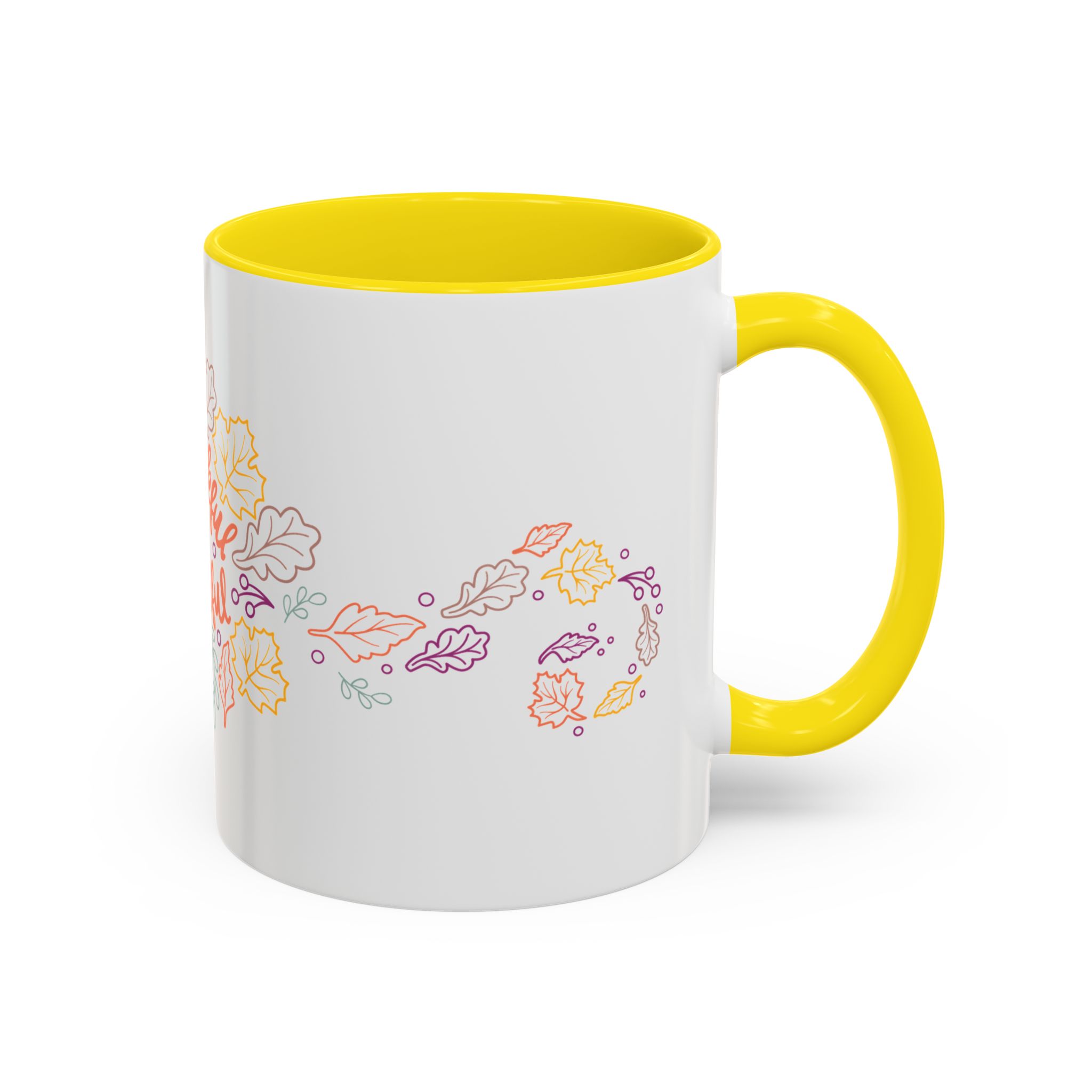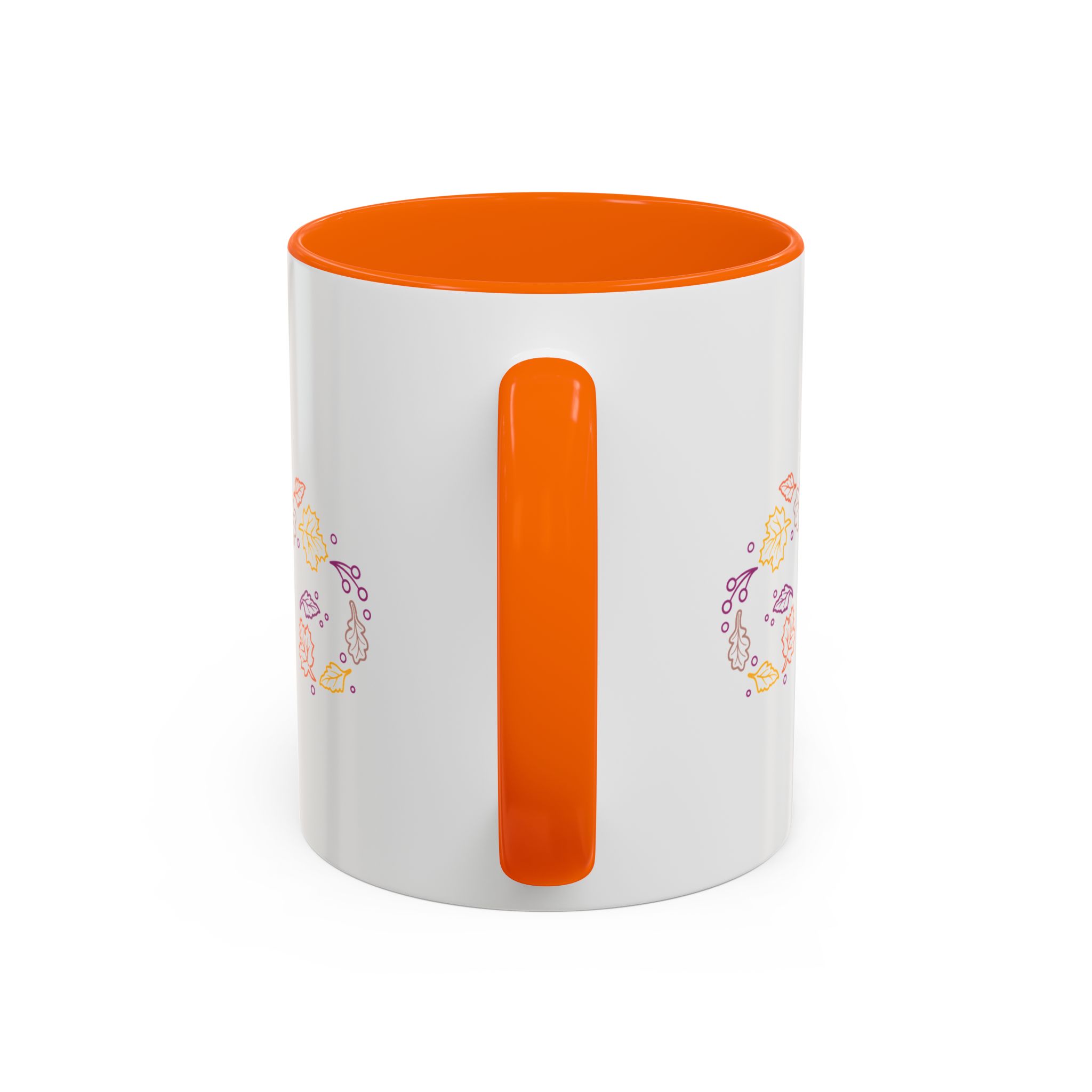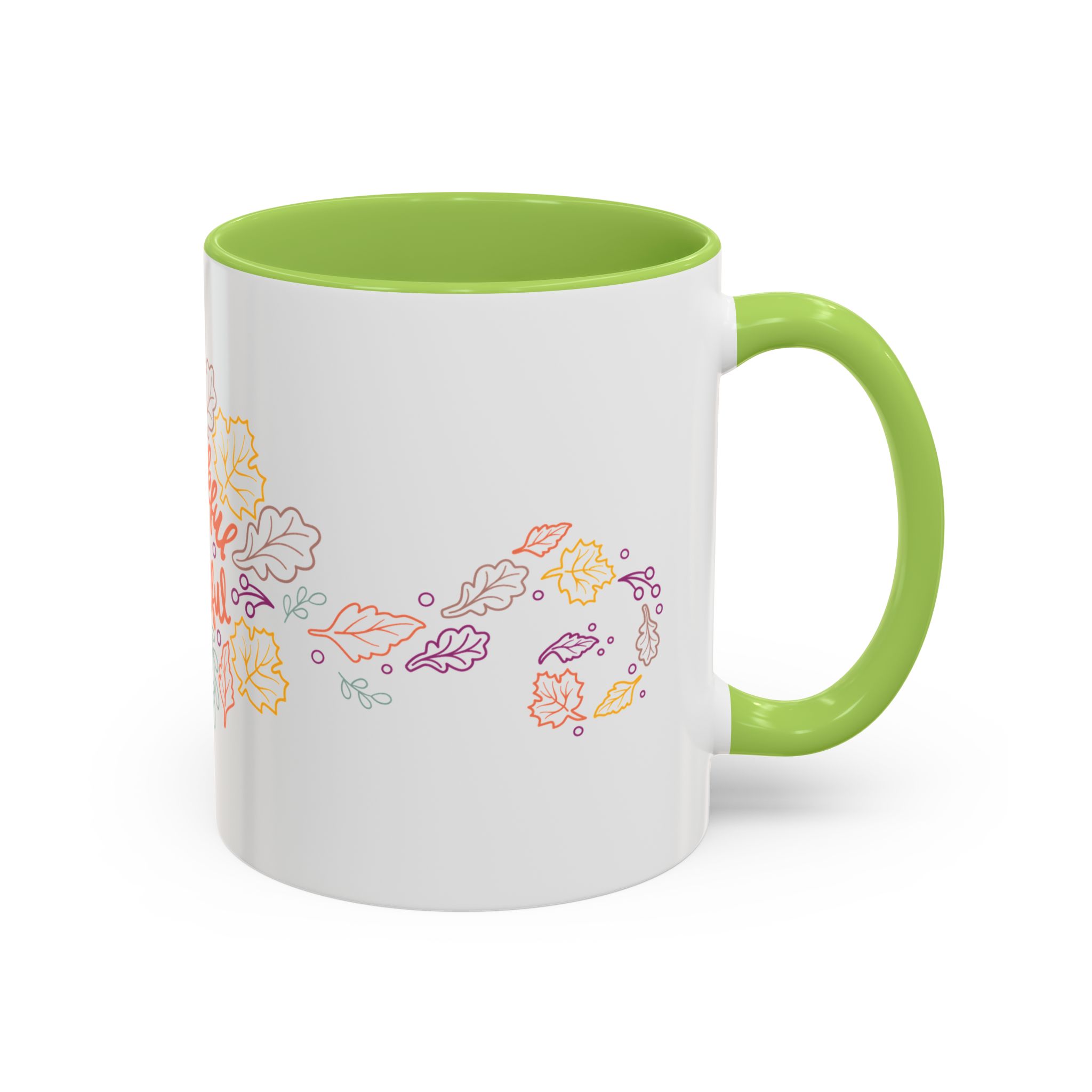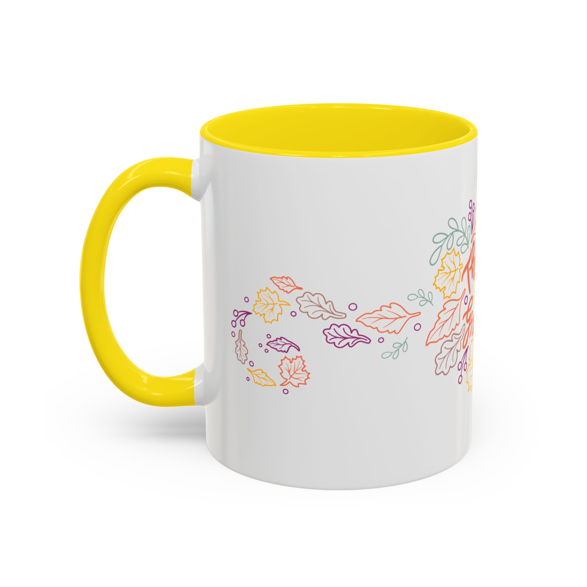 Falling autumn leaves swirl around the words Thankful and Grateful in this original design made by me; Scribbles the Scribe, with no AI involvement. This mug is available with 3 different color interior options.